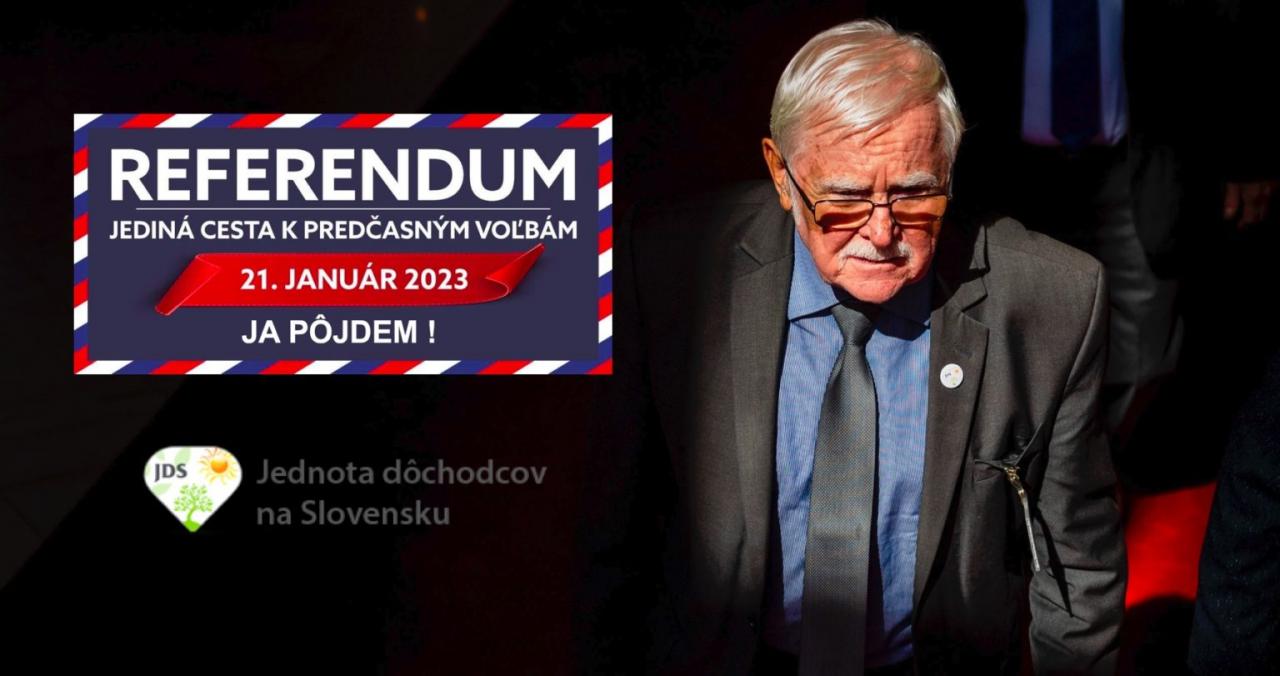 Jednota dôchodcov na Slovensku podporuje referendum, ktoré sa uskutoční 21. januára 2023, ako priamy nástroj a hlas občanov Slovenska. Referendum je základným, demokratickým nástrojom, ktorý je zakotvený priamo v Ústave Slovenskej republiky. JDS si ctí demokraciu a podporuje všetky aktivity, ktoré vedú k jej uplatňovaniu a ďalšiemu prehlbovaniu v našom štáte. V tomto duchu vníma a podporuje ideu vyhláseného referenda, aby bolo možné na Slovensku vyvolať predčasné voľby referendom občanov alebo rozhodnutím NR SR.