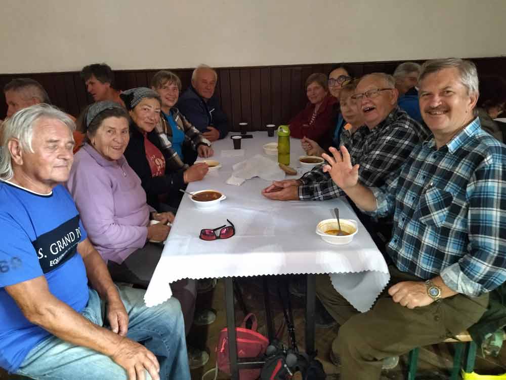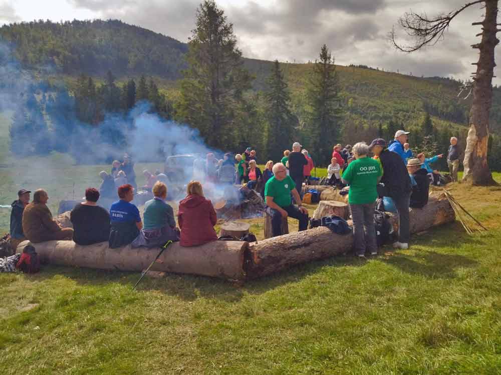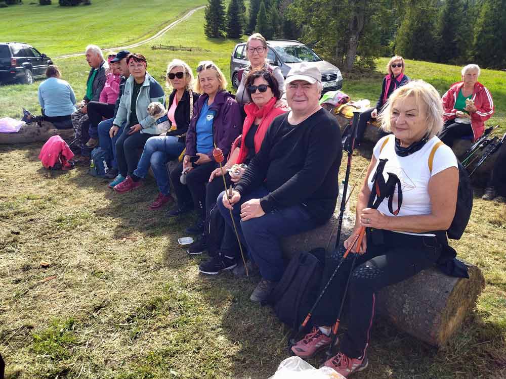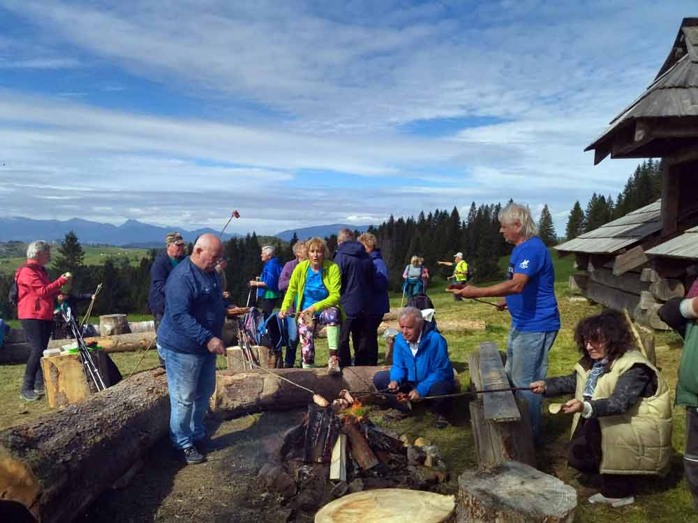 Pri pajte boli pripravené dve ohniská, prírodné sedenie na pňoch a napílených kmeňoch stromov. Nechýbali ani palice na opekanie a tak si mohli všetci dať klasické turistické občerstvenie – kto si čo priniesol. Bola to predovšetkým slaninka a tradičné špekáčiky. Celým Grúňom sa čoskoro niesla nielen vôňa opekaných špekáčikov a slaninky, ale aj spev nadšených seniorských turistov.
